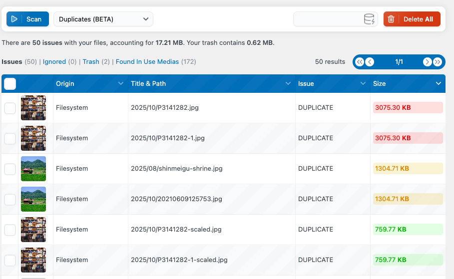 The goal of this scan is pretty straightforward, it will go through your physical files on your server and for each of them check if there is a duplicate. If there is, it will be marked as an issue. Note that both files (the one scanned and the duplicate(s)) will be in the issue, and it will be your role to determine which one should be deleted or not.