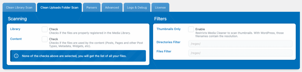 The Library scanning matches files against your Media Library entries. This is the most effective way to clean your installation: if only this option is selected, all files that aren’t linked to a media entry will be flagged as unused.