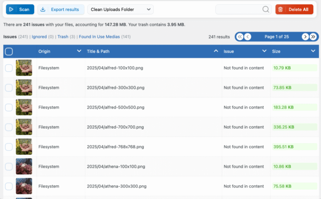 In the dashboard, make sure you have the “Clean Uploads Folder Scan” scan method selected and click the Scan button. You will see all the media that have not been found across your website. You’ll likely find many more “issues” than with the Media Library scan. As you can see here, when a media file is not used, all of its thumbnails are individually detected as not in use.