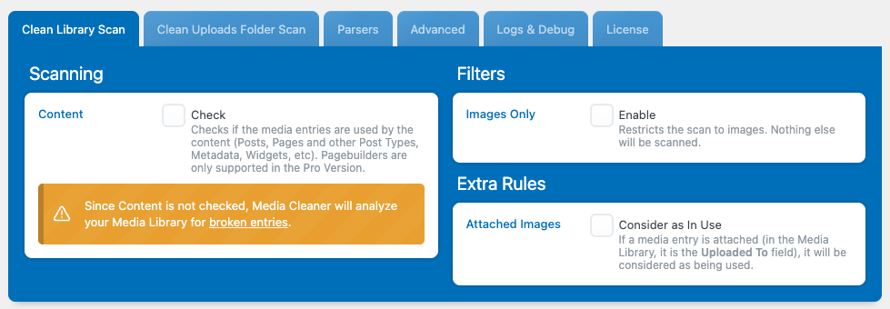 If you did not select “Content,” the Clean Library Scan will look for broken entries in your Media Library. If you have some “ghost entries,” meaning there is actually a media declared but no file to match it on your server, it will be scanned as “Not attached file.”