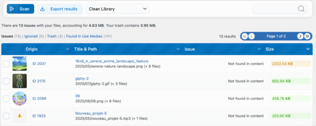 In the dashboard, make sure you have the “Clean Library” scan method selected and click the Scan button. You will see all the media that have not been found across your website. When using this type of scan, you’ll notice entries like “(+ 8 files)”—this means that the media has 8 thumbnails in addition to the original file.